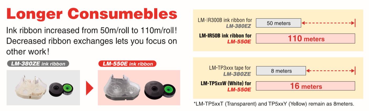 + Độ dài băng mực tăng từ 50m/cuộn lên 110m/cuộn (Băng mực sử dụng cho máy in đầu cốt LM-380, LM-390 dài 50m).