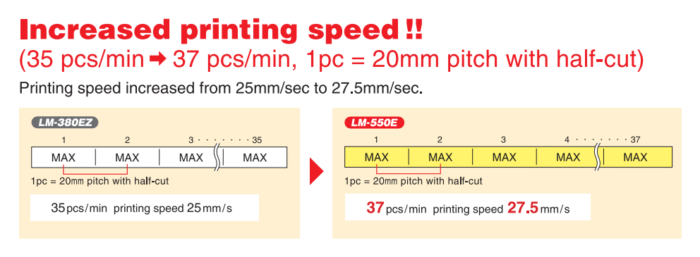 - Máy in đánh chữ LM-550E cho phép in chữ tốc độ 27.5 mm/s, nhanh hơn tốc độ in của LM-380EZ (25 mm/s).